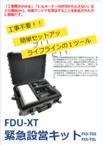 弊社Thuraya外部アンテナ設置コンサルティングおよび工事のノウハウを生かしてご提案いたします。 *参考としてFDU-XT緊急設営キットについて右図を参照してください。 衛星携帯電話向け「緊急通信網」緊急設営キット 災
